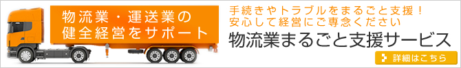 我が国のサプライチェーンの"命綱"の役割を担っている物流業(トラック、倉庫など)・運送業の健全経営をサポートする「物流業まるごと支援サービス」など、特定社会保険労務士、行政書士、産業カウンセラーなどを活用した、ワンストップの支援サービスをご提供します。